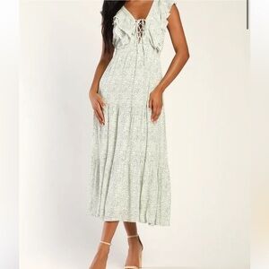 Lulus Exclusive! Fall in love every time you wear the Lulus Romance in Bloom Cream Floral Print Ruffled Tiered Midi Dress! Lightweight woven fabric, with a ditsy sage green floral print, shapes this dress with a lace-up V-neckline and ruffled straps that travel down the fitted bodice. A high waist tops a tiered midi skirt to complete this cute piece! Elastic at the back of the waist for fit.