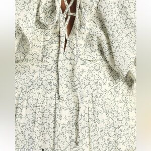 Lulu’s Romance In Bloom floral Small Print dress. Sort of a dusty blue gray or sage small floral print on a cream background.