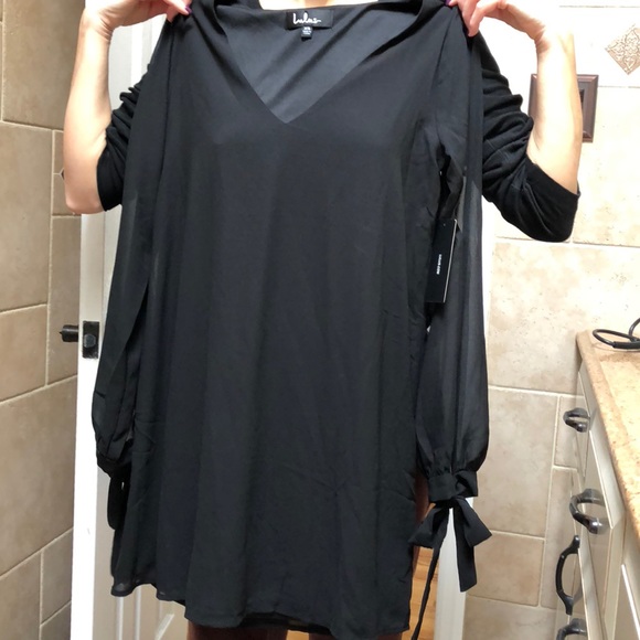 XS black dress. Never worn. NEW WITH TAGS. Goes great with a pair of heels. Long sleeve on both side. v neck top.