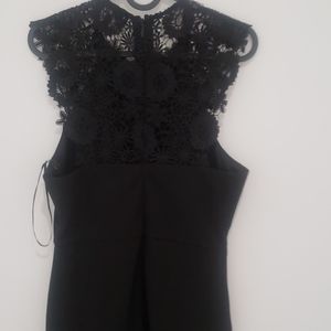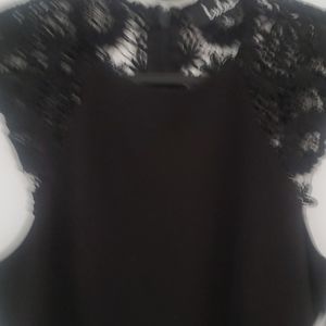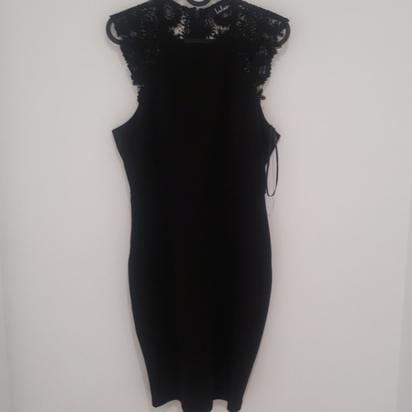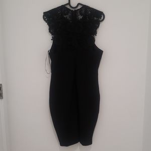 Fitted knee length black Lulus dress with lace details on the back and sleaves.