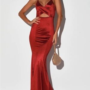 LULU’S Destined Love Wine Red Satin Backless Cutout Mermaid Maxi Dress
