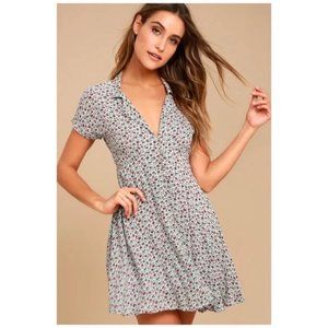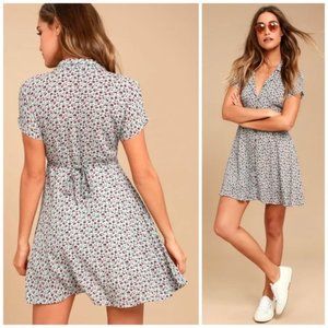 Be the cutest honeybee in the hive with the Lulus Just Like Honey Light Blue Floral Print Skater Dress! Ditsy pink, burgundy, and green floral print decorates this adorable woven dress with a collared neckline, short sleeves, and a full button placket. Skater skirt features a waist tie at back.