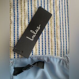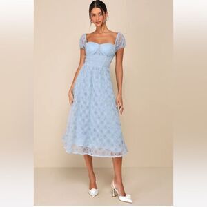 LULUS EXCEEDINGLY ELEGANT BLUE FLORAL APPLIQUÉ BUSTIER MIDI DRESS SZ L NWT