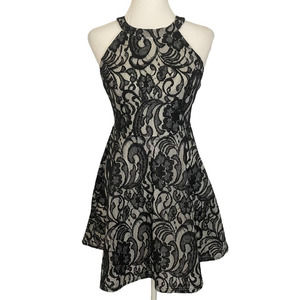Style: Lulus Exclusive! You're always ready to party in the Lulus Enchanting Evening Black and White Lace Backless Skater Dress! Black floral lace is bonded to white, woven mesh to form this twirl-worthy dress that boasts sweet deets like a halter neckline (with top button closure) and two sets of adjustable spaghetti straps that fall down across an open back. Princess-seamed bodice and fitted waist top a flirty skater skirt with a mini hem. Also features: