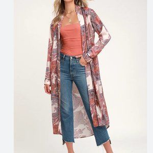 LULUS Fiji Blush Pink Paisley Print Satin Robe with Tie size small