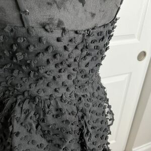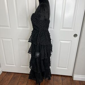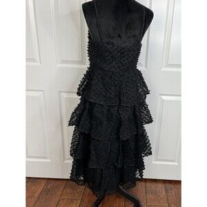 LULU’S Flirting with You Black Tiered Pom Pom Midi Dress Medium NWT