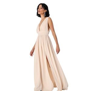 You'll be goddess-like for the entire evening in the Lulus Heavenly Hues Cream Maxi Dress! Georgette fabric drapes alongside a V-neck and back, and lays across a banded waist. Full maxi skirt has a sexy side slit. Hidden back zipper with clasp.