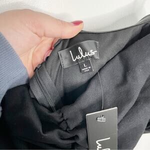 LULUS Impress Release Black Off the Shoulder Puff Sleeve Jumpsuit Size Large Size large New with tags. Never been worn! 65% rayon 30% nylon 5% spandex Features: off the shoulder puff sleeves, ruched bodice, cropped wide leg pants, hidden back zipper MEASUREMENTS (in inches): Bust: 12 in across Length: 52 in Sleeve length: 7 in Inseam: 27 in I am open to offers and happy to answer any questions you may have! Keywords: black jumpsuit formal fancy cocktail wedding guest night out