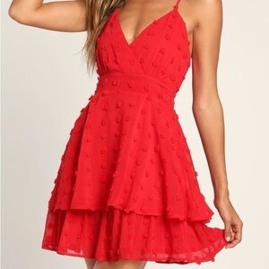 LULU’S Just One Twirl Red Polka Dot Tiered Mini Skater Dress