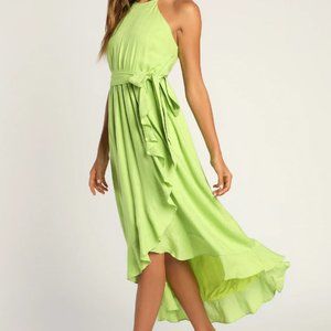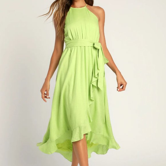 LULUS Lime Green Faux-Wrap Ruffled Midi Dress