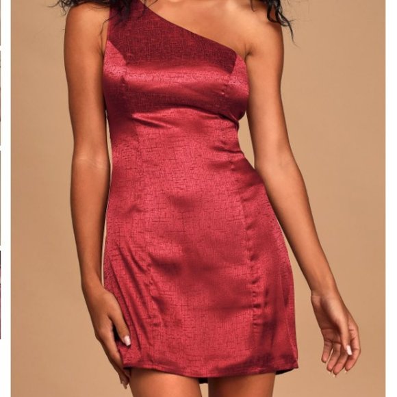 LULUS Lisette One-Shoulder Burgundy Satin Jacquard Cocktail Minidress
