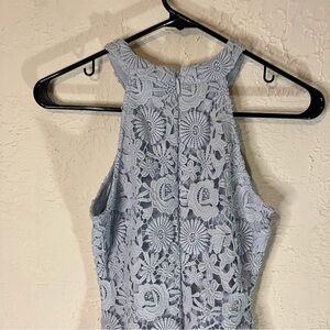 In excellent used condition no rips, tears or stains. Lulus Exclusive! You'll be collecting notes from secret admirers right and left when you don the Lulus Love Poem Light Blue Lace Mini Dress! A lively pattern of non-stretch crochet floral lace creates an eye-catching overlay atop knit fabric lining. Halter neckline and darted sleeveless bodice transition into a chic, sheath skirt with a mini. Hidden back zipper with clasp.
