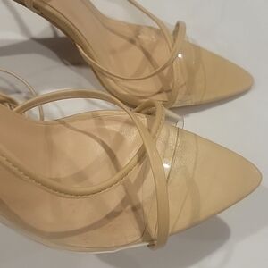 *Vinyl clear and nude lace up ankle open toe heels.