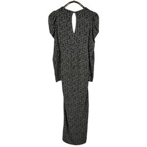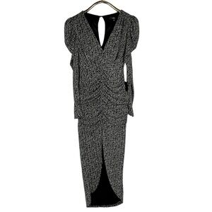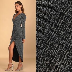 LULUS PARTY GLAM METALLIC BLACK SILVER LONG PUFF SLEEVE KEYHOLE RUCHE MIDI DRESS