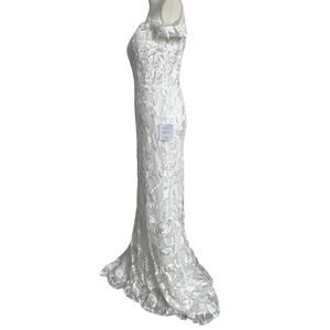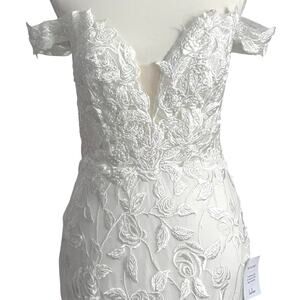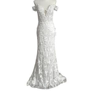 We're in love with this stunning dress, which features a mesh overlay (set atop a matching knit liner) and intricate floral embroidery, with embedded beaded details throughout. Short sleeves frame the romantic sweetheart neckline (with a tulle insert) and the off-the-shoulder bodice that boasts sheer accents and hidden supportive boning. Fitted waist flows into a cascading mermaid silhouette that ends at an elegant maxi hem with a train at the back. Hidden back zipper/clasp.
