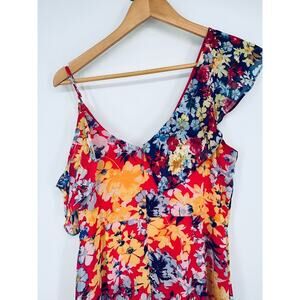 Twirl all of your problems away in the Lulus Radiant Ruby Red Floral Print Chiffon Maxi Dress! Red chiffon, with a yellow, blue, and white floral print, constructs this beautiful asymmetrical maxi dress with a V-neckline and darted bodice. An empire waist and faux wrap bodice are supported by a thick tank strap and a cold shoulder, with an adjustable strap, that are both sweetly accented by ruffle details that carry into the pretty maxi skirt with a tiered ruffle hem. Hidden clasp/zipper at back.