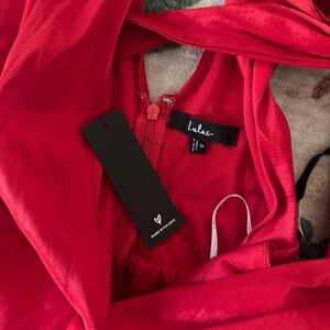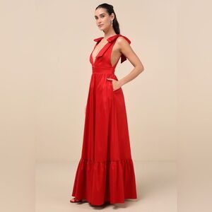 LULU’S Rare Charm Red Taffeta Tie-Strap Maxi Dress With Pockets