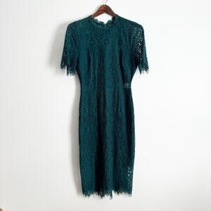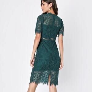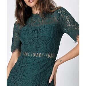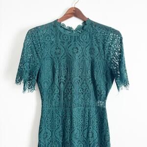 LULUS Remarkable Sheer Lace Short Sleeve Midi Dress Forest Green Medium M