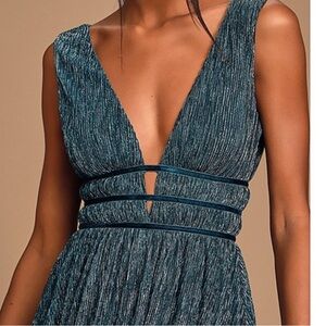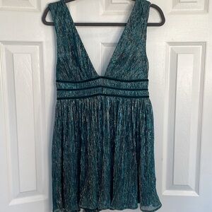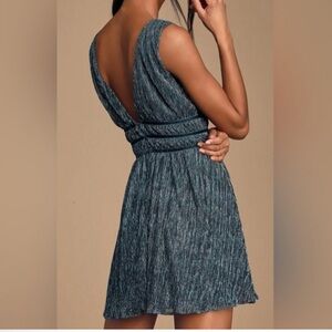 LULUS SMOKESHOW V NECK SLEEVELESS TEAL & SILVER METALLIC MINI SKATER DRESS SZ S