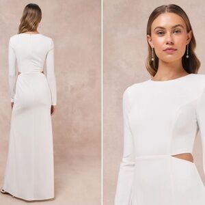 You'll be compliment-bound when you walk in wearing the Lulus Going for the Wow White Long Sleeve Cutout Maxi Dress! Stretchy techno crepe knit shapes a princess-seamed bodice and a crew neckline, framed by long sleeves. Twin cutouts at the waist top a figure-flaunting skirt that cascades down to an elegant maxi hem with a flirty thigh-high side slit. Hidden back zipper/clasp.