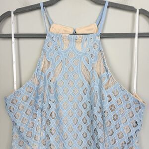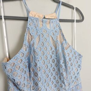 Beautiful lace mini dress by Lulu’s. Light blue with tan lining. Halter neckline with cutout back and triple button closure. Back hidden zipper. Great condition. Women’s size extra large (xlarge, X-large).