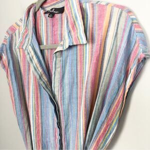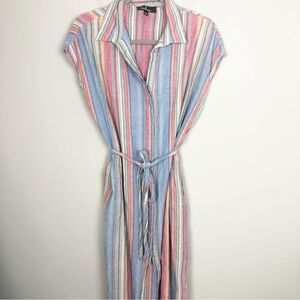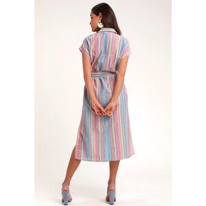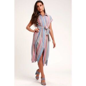 Super cute multicolor shirt style midi dress by Lulus. Button up front. Short sleeves. Belted waist (removable). Vertical stripes. Slit in the front and paneled side slits. Great condition. Womens size medium.