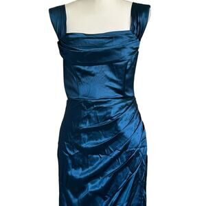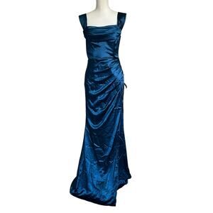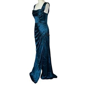 Sleek woven satin shapes gathered off-the-shoulder straps that frame a pleated and seamed bodice with a fitted waist. Figure-skimming maxi skirt features an elegant gathered detail at the side and a thigh-high side slit, before ending at a maxi hem. Hidden zipper/clasp at back.