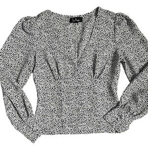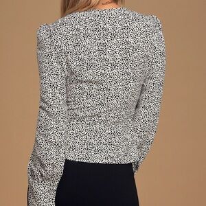 White and black long sleeve blouse from Lulus in a size XS. This blouse features a neutral cheetah print throughout. The top buttons up the front forming a deep v neckline. The top also features gathered shoulders and buttoned cuffs. This top is in excellent preloved condition with no flaws.