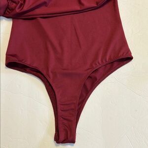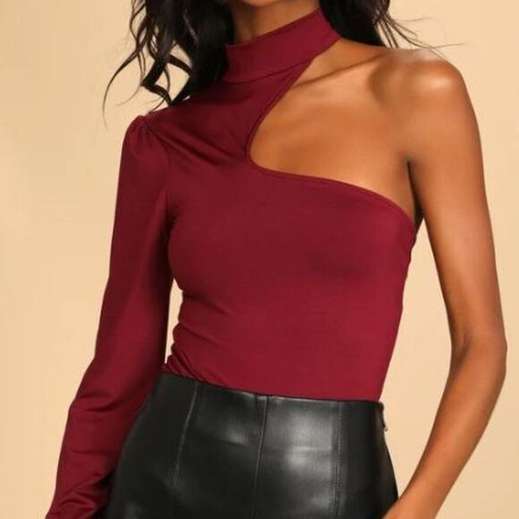Size x-small Lulu's one shoulder bodysuit. Get a confidence boost every time you wear the Lulus Majorly Confident Burgundy One-Shoulder Long Sleeve Bodysuit! Sleek stretch knit shapes this bodysuit that has a mock neckline (that buttons at the back) and a cutout above the bust that creates a one-shoulder silhouette. The fitted bodice has thong bottoms with snap closures. Single long sleeve.