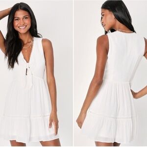 A fun summer look like the Lulus Lively Beauty White Tie-Front Tiered Mini Dress is destined to get you a compliment or two! This cute dress is composed of gauzy linen-like woven fabric that shapes a V-neckline and a sleeveless bodice with darted seam detailing and a tie-front detail that creates a flirty keyhole cutout. An elasticized waist tops tiered skater skirt that falls to a sweet mini hem. Intricate crochet lace accents the neckline and skirt. Hidden side zipper/clasp.