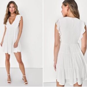 There's nothing sweeter than a sunny day spent in the Lulus Dreamy Designs White Ruffled Tiered Swiss Dot Mini Dress! Lightweight woven fabric, with a Swiss dot texture throughout, shapes this darling dress that has ruffled trim along the shoulders and down the bodice, framing a plunging V-neckline. Tiered skirt falls to a mini hem. Hidden zipper/clasp at back.