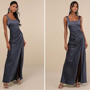 You'll always capture a heart or two when you arrive wearing the Lulus Red Carpet Romance Dark Grey Satin Square Neck Maxi Dress! Sleek woven satin shapes this elegant dress that has wide tank straps and a square neckline, atop a darted bodice with a fitted waist. The figure-skimming skirt has an overlapping silhouette, with gathered, draping details at the side, that falls to a maxi hem with a sultry side slit. Hidden zipper/clasp at back.