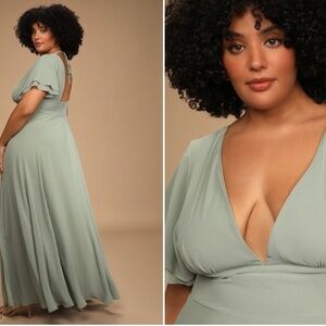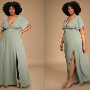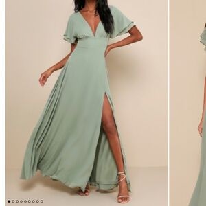 The Lulus Promise Of Love Sage Brush Flutter Sleeve Maxi Dress will bring a lifetime of cherished memories and togetherness! Lightweight woven chiffon shapes this alluring dress with a deep V-neckline, a gathered bodice, and double-tiered flutter sleeves. A high, fitted empire waist sits atop a flowy, maxi skirt with a sexy, thigh-high side slit. Turn around to reveal a cutout back with a flirty tying detail. Hidden back zipper/clasp.