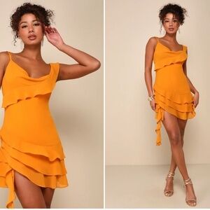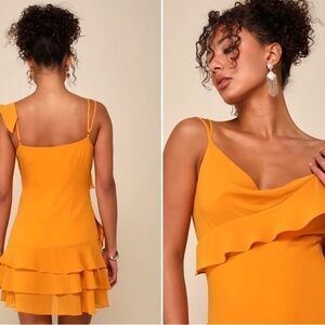 You'll light up every room you enter in the Lulus Alluring Presence Golden Yellow Ruffled Tiered Mini Dress! Lightweight woven chiffon shapes this elegant little dress with adjustable spaghetti straps and an asymmetrical ruffled detail that continues across the cowl neckline and fitted bodice. The figure-skimming slip silhouette falls to a tiered, ruffled hem with a ruffled sash detail. Hidden side zipper/clasp.