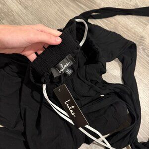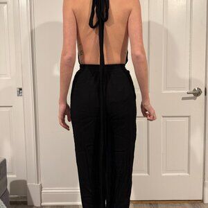 never been worn before. Low cut, halter top, strapless back romper with little bow details on the ankle. Super flattering romper. Size XS but I am usually a size S and 5'7 and it fits well.