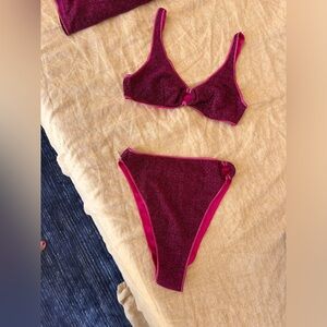 Vibrant pink swimwear with a shimmering texture. Perfect for a stylish beach look.