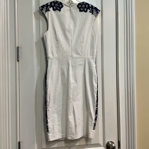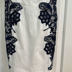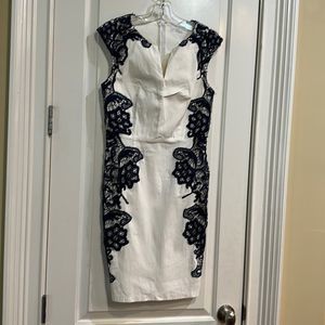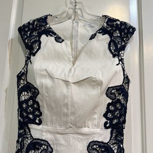 LUNA DRESS, BLUE AND WHITE LACE SZ 6, small slit in back , this is the ultimate spring summer dress - 75 percent viscose, my fav stretch material that holds you and shapes you! Amaxing dress for any occasion! Length 37". Approx