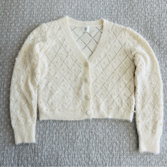 LUNA IVY Diamond Pattern Cardigan Sweater Pearls Beaded Fuzzy Coquette