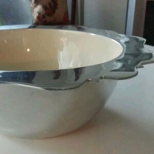 Simply stunning! This unique, elegant hand-crafted piece is a part of the exclusive Lunares Collection sold in Bloomingdales and Neiman Marcus. The platinum silver shine of its exterior contrasts beautifully with its pearlescent, cream finished core, done in porcelain enamel. Hand-made and sand cast of Lunares' proprietary metal alloy, which is guaranteed to "never tarnish, chip, peel or break." Size: 16"x 9"x 5". Original retail price, $285. Don't miss it!