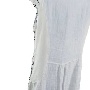 Details: Gorgeous white linen dress with embroidered vine | floral pattern on front. Goring side panels for stretch. Cap sleeve. Side pockets. Slip on style. Cool and carefree sun dress for a day at the beach or a picnic!