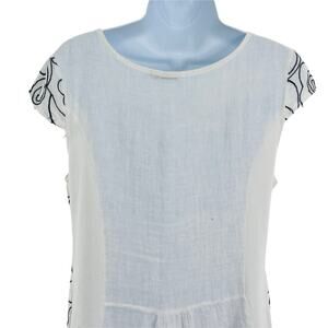LUNGO L'ARNO White Linen Dress Blue Floral Embroidered Beaded Cap Sleeve S