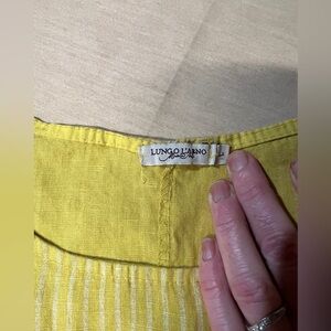 Yellow and white stripe 💯 linen top from LUNGO L’ARNO, size L.  Top has scoop neckline, ruffle hemline and 3/4 sleeves.