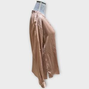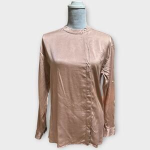 Luxury and comfort meet in this LUNYA 100% silk top. Designed with their signature “Good in Bed” ethos, this long sleeve blouse is crafted from washable silk in a soft blush pink shade. Features a crew neckline with asymmetrical button detail, hidden placket, long sleeves with button cuffs, and a relaxed silhouette that drapes beautifully. Can be styled as elevated loungewear, sleepwear, or dressed up with trousers or skirts.