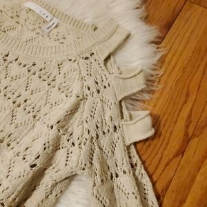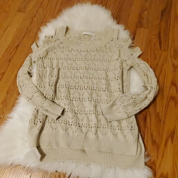 Cream sweater with open shoulder design. Slitted sides, a tad longer in the back