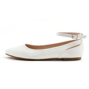 LURNYET Women's WHITE PU Casual Ankle Strap Pointed Toe Ballet Flats Shoes