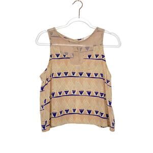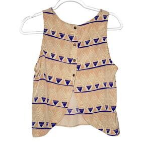 LUSH Aztec Print Cropped Top Scalloped Back Button Down Geometric Tan Blue Sz M