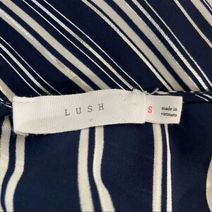 LUSH Blouse Womens Small Navy Blue Metallic Silver Striped Open Back Top