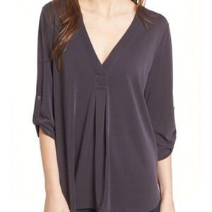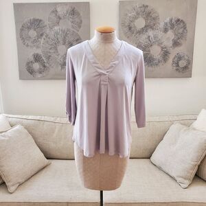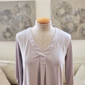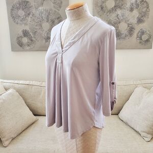 AN101 (tags: top, shirt, blouse, flowy, relaxed, loose, tunic, 3/4 sleeve, rolled sleeve, cupro, roll sleeve, V-neck, grey, gray, silver, casual, office, work, business casual)