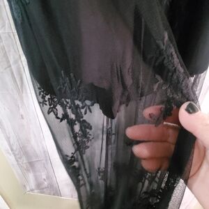 please see all pics the very last pic is a stock photo. not the sane item I'm listing. I have it for a somewhat reference. mine has short sleeves. and front lace splits down middle to flow on sides when walking.
