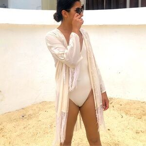 LUSH Women’s Fringe Embroidered Kimono Coverup Size Medium Bohemium Tulum Yacht